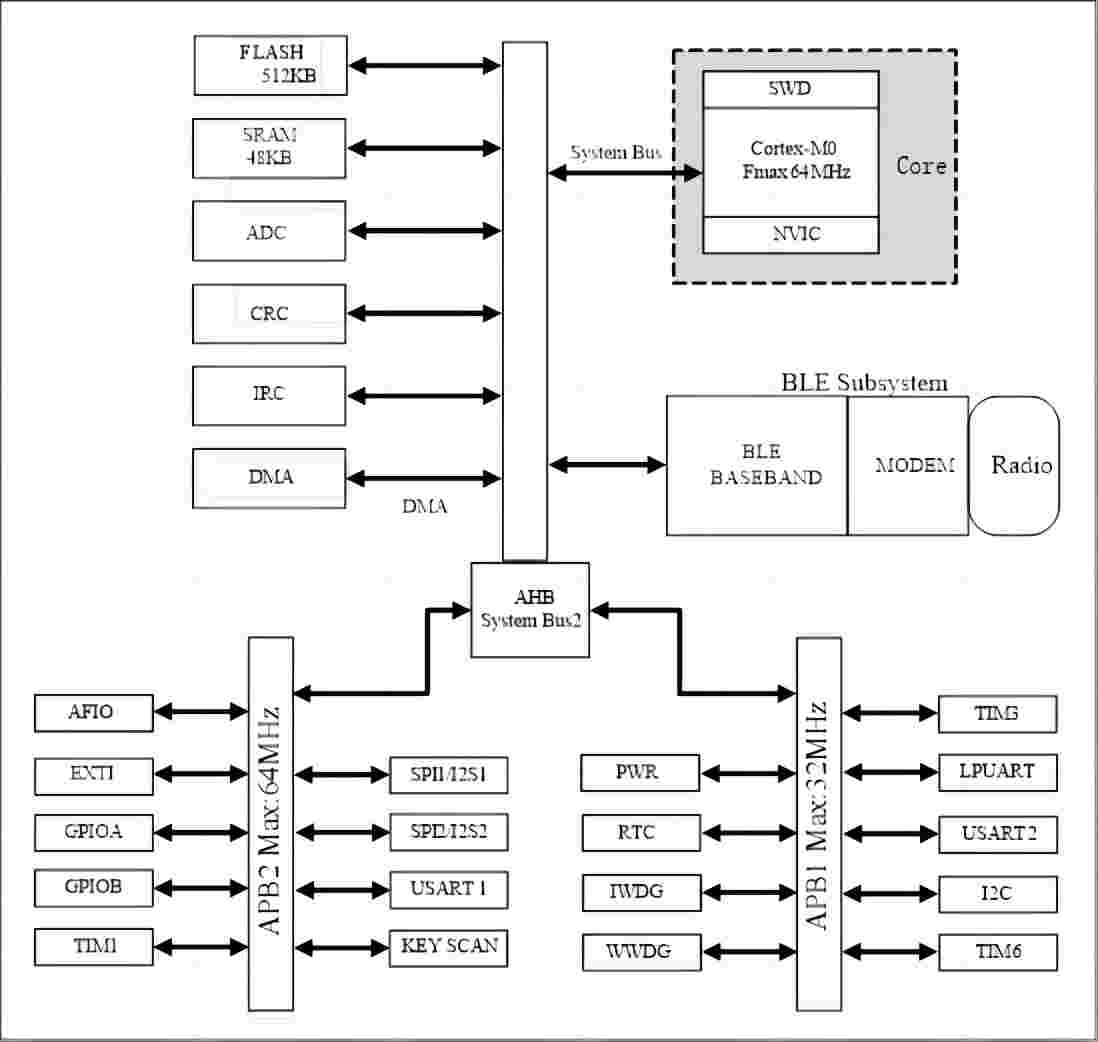 藍牙芯片是InnoStar新一代高性能、超低功耗的藍牙5.1芯片,采用32位ARM Cortex-M0內(nèi)核,最高工作主頻64MHz,片上集成48KB SRAM,512KB Flash。