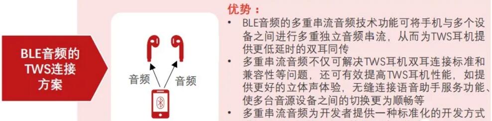 BLEA標(biāo)準(zhǔn)采用多重串流音頻技術(shù),可實(shí)現(xiàn)無線多路直聯(lián),單一音頻輸出設(shè)備與一個(gè)或多個(gè)音頻接收設(shè)備之間,可同步進(jìn)行多重且獨(dú)立的音頻串流傳輸。BLEA標(biāo)準(zhǔn)的頒布打破蘋果TWS專利封鎖,解決TWS耳機(jī)雙耳直連的標(biāo)準(zhǔn)問題和兼容性問題,為安卓TWS廠商提供標(biāo)準(zhǔn)化的TWS耳機(jī)開發(fā)方式,有助于釋放安卓TWS廠商的生產(chǎn)力。