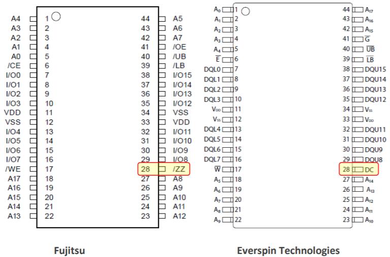 MRAM,組織為256kx16,由標(biāo)稱3.3V電源供電,并與FRAM兼容。兩款產(chǎn)品均使用標(biāo)準(zhǔn)SRAM并行地址(A0-16)、字節(jié)寬雙向數(shù)據(jù)引腳(DQ0-7)和控制信號(hào)(/E、/W、/G)。每個(gè)都可以由一個(gè)公共定時(shí)接口支持,并將用作隨機(jī)存取讀/寫存儲(chǔ)器,在斷電時(shí)無需外部電池即可保留數(shù)據(jù)。Everspin不支持/ZZ睡眠功能。/ZZ可能需要上拉。
