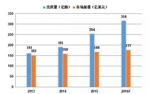 IC Insights研究報告顯示,2015年全球MCU市場規(guī)模達到168億美元,較去年增長5.6%,出貨量255億顆比去年提升12.4%,預計2016年全球MCU市場出貨量將突破300億顆大關。其中,2015年全球32位MCU出貨量超過4/8位MCU與16位MCU出貨量的總和,而且未來幾年應該會保持30%左右的高速增長的水平。