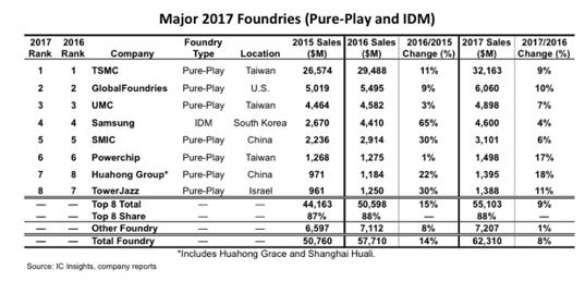 根據(jù)IC Insights最新研究報(bào)告顯示,2017年全球八大晶圓廠商銷售額總計(jì)達(dá)551.03億美元,同比增長9%,比2016年的15%增速有所放緩。這8家廠商2017年的市場份額達(dá)到88%,市占率與2016年相同。