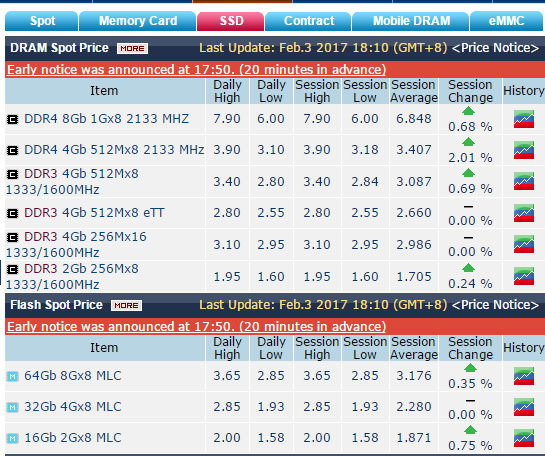 內(nèi)存漲價(jià)已經(jīng)是2016年下半年來(lái)的主流趨勢(shì),2017年開年也是如此,而且本季度漲的可能更兇了,從Dramxchange的統(tǒng)計(jì)數(shù)據(jù)來(lái)看,1月份以來(lái)4Gb DDR4顆粒價(jià)格飆升0.51美元,漲幅18%,截至2月3日4Gb DDR4顆粒的高位價(jià)格達(dá)到了3.9美元,平均也有3.4美元,這是2015年7月30日以來(lái)的新紀(jì)錄,創(chuàng)下18個(gè)月來(lái)新高。