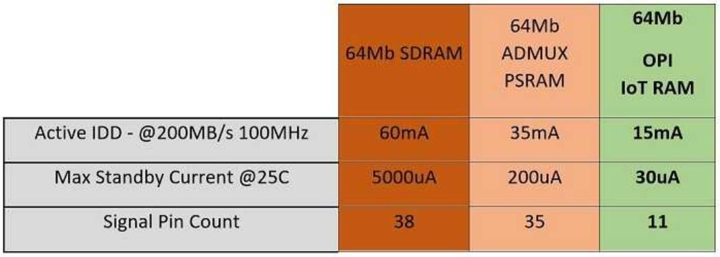 ram替換DRAM,消除了對(duì)外部刷新控制器的需求,這降低了接口的復(fù)雜性和相關(guān)的驗(yàn)證成本,利用了外部SPI接口的使用,同時(shí)保持了最新IoT應(yīng)用程序所要求的高性能水平,并降低整個(gè)系統(tǒng)的功耗。有些基于MCU的舊系統(tǒng)仍在使用SDRAM,在降低功耗和簡(jiǎn)化接口方面,可以受益于IoT RAM的使用。下表清楚顯示了待機(jī)電流和有功電流的優(yōu)點(diǎn),同時(shí)保持了相當(dāng)?shù)膫鬏斔俾省?/div>