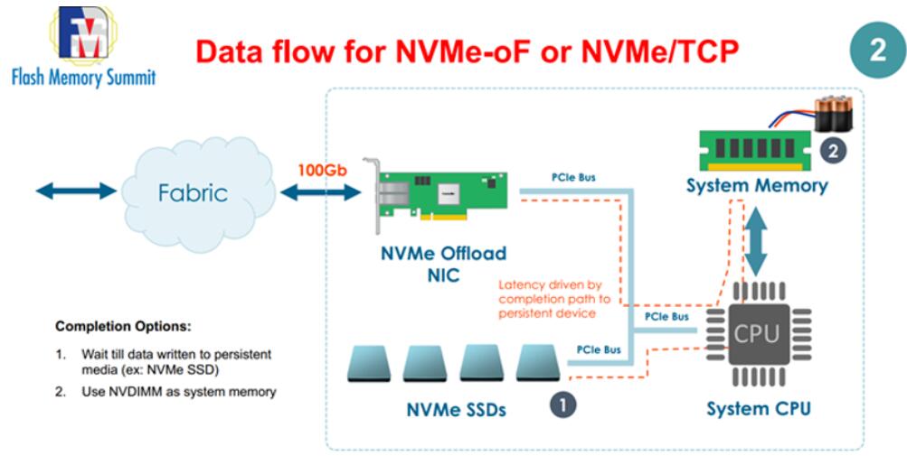 以下圖片是傳統(tǒng)的NVMe-oF的數(shù)據(jù)流,要通過系統(tǒng)內(nèi)存和CPU再進(jìn)入NVMe SSD,這樣會(huì)導(dǎo)致讀寫延遲比較長。