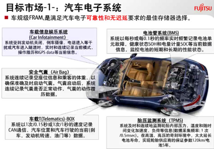 富士通FRAM早已能適用如汽車安全氣囊數(shù)據(jù)信息存儲(Airbag)、安全事故數(shù)據(jù)信息記錄軟件(EDR)、充電電池智能管理系統(tǒng)(BMS)、新能源汽車全車自動控制系統(tǒng)(VCU),新能源汽車CAN小盒子(CAN-BOX)、新能源汽車載終端設(shè)備(T-BOX)、胎壓監(jiān)測裝置(TPMS)、車輛駕駛輔助系統(tǒng)軟件(ADAS)及導(dǎo)航欄與信息內(nèi)容車載多媒體(infotainment)等運(yùn)用中的即時(shí)且不斷的數(shù)據(jù)信息存儲,所以能減少系統(tǒng)軟件復(fù)雜性并提升數(shù)據(jù)庫安全,。