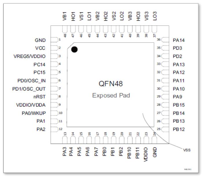 國產(chǎn)32位單片機(jī)MM32SPIN360C擁有M0內(nèi)核的高性能32位微控制器,5V輸出的LDO穩(wěn)壓器、三組具備有自舉二極管的N通道半橋柵極驅(qū)動(dòng)器。MCU最高工作頻率可達(dá)96MHz,并內(nèi)置SRAM高速存儲(chǔ)器,增強(qiáng)豐富型I/O端口和外設(shè)連接到外部總線。采用QFN48封裝形式。本產(chǎn)品包含2個(gè)12位的ADC、3個(gè)比較器、3個(gè)運(yùn)算放大器、1個(gè)16位通用定時(shí)器、1個(gè)32位通用定時(shí)器、3個(gè)16位基本定時(shí)器、2個(gè)16位高級定時(shí)器。還包含標(biāo)準(zhǔn)的通信接口:1個(gè)I2C接口、1個(gè)SPI接口和2個(gè)UART接口。