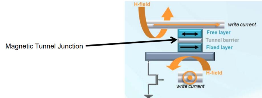 MRAM或磁性隨機存取存儲器使用1晶體管–1磁性隧道結(jié)(1T-1MTJ)架構(gòu),其中鐵磁材料的磁性“狀態(tài)”作為數(shù)據(jù)存儲元素。由于MRAM使用磁性狀態(tài)進行存儲(而不是隨時間推移而“泄漏”的電荷),因此
