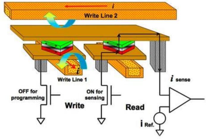 MRAM可以提供非常長的數(shù)據(jù)保留時間(+20年)和無限的耐用性。切換磁極化(Write Cycle)是在電磁隧道結(jié)(MTJ)上方和下方的導(dǎo)線中產(chǎn)生脈沖電流的結(jié)果(見圖1)。