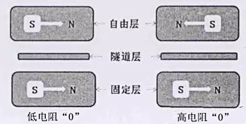 如下圖二所示,MTJ有三層,最上層為自由層,中間是隧道結(jié),下面是固定層。自由層的磁場極化方向是可以改變的,而固定層的磁場方向固定不變。當(dāng)自由層與固定層的磁場平行時,存儲單元呈現(xiàn)低阻態(tài);當(dāng)磁場方向相反時,存儲單元呈現(xiàn)高阻態(tài)。MRAM通過檢測存儲單元電阻的高低,來判斷所存數(shù)據(jù)是0還是1。