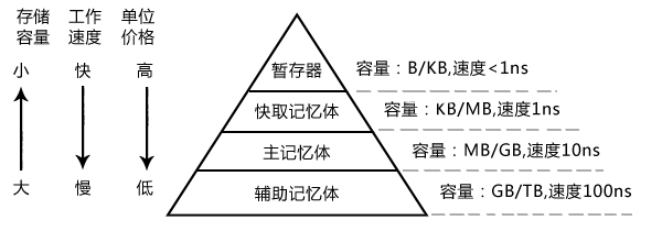 工作速度:輔助存儲器(1ms)< 主存儲器(10ns)< 快取存儲器(1ns)< 暫存器(1ns)。