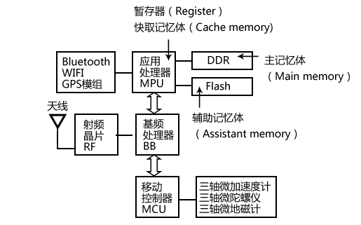 所有的電子產(chǎn)品都必須用到存儲器,而且通常用到不只一種存儲器,由于存儲器的種類繁多,常常讓使用者混淆,我們簡單說明不同存儲器之間的差異,圖三為手機主要芯片的系統(tǒng)方塊圖(System block diagram),包括:應(yīng)用處理器(Application processor)、基頻處理器(Baseband processor)、運動控制器(Motion Controller)。