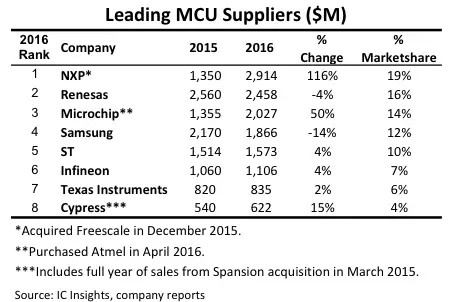 由于瑞薩、三星以及意法半導體等廠商未發(fā)起行業(yè)并購,所以2016年微控制器業(yè)務營收僅有小幅成長,有些甚至還出現(xiàn)下跌。譬如,三星去年MCU業(yè)務就出現(xiàn)大幅跌落,是前8大MCU廠商唯一下滑超過10%的廠商。
